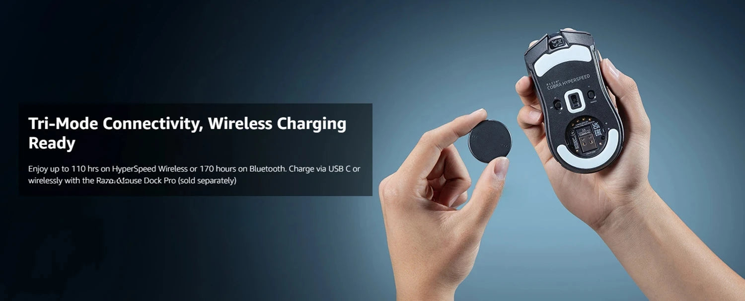 Enjoy up to 110 hrs on HyperSpeed Wireless or 170 hours on Bluetooth. Charge via USB C or wirelessly with the Razer Mouse Dock Pro (sold separately)
